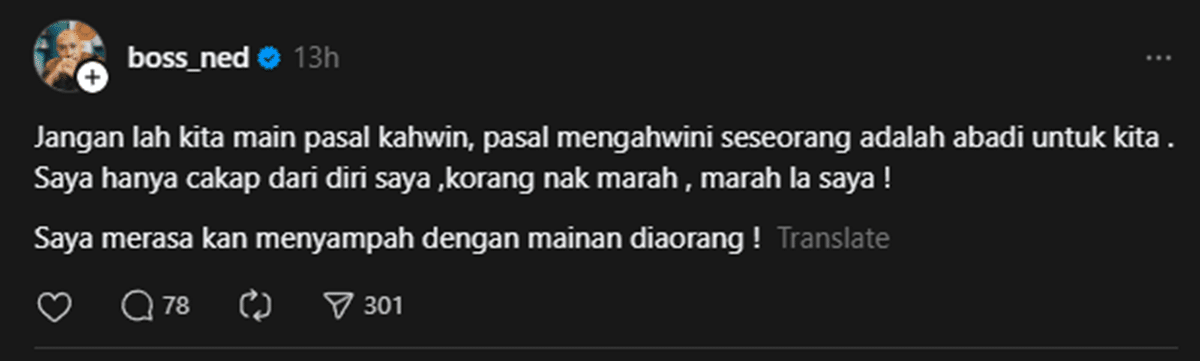Melalui satu hantaran di Threads, Boss Ned kongsi rasa tak puas hati dengan trend pelik ni. Katanya, kahwin bukan benda untuk dibuat main-main sebab ia ikatan yang sepatutnya kekal abadi.
