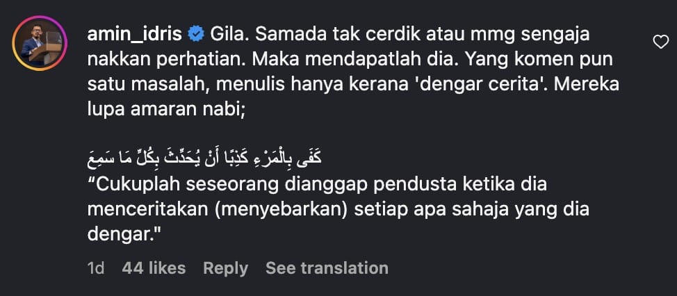 Perkara itu turut mendapat perhatian rakan artis lain yang tampil memberikan pandangan. Pengacara televisyen dan penceramah bebas, Amin Idris menyifatkan tindakan itu hanya untuk mencari perhatian.