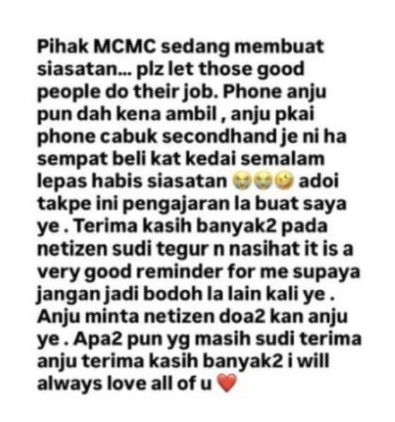 Menurut Anju, pihak SKMM bukan saja ambil keterangan daripadanya, tapi telefon bimbit miliknya juga telah dirampas bagi tujuan siasatan lebih mendalam.