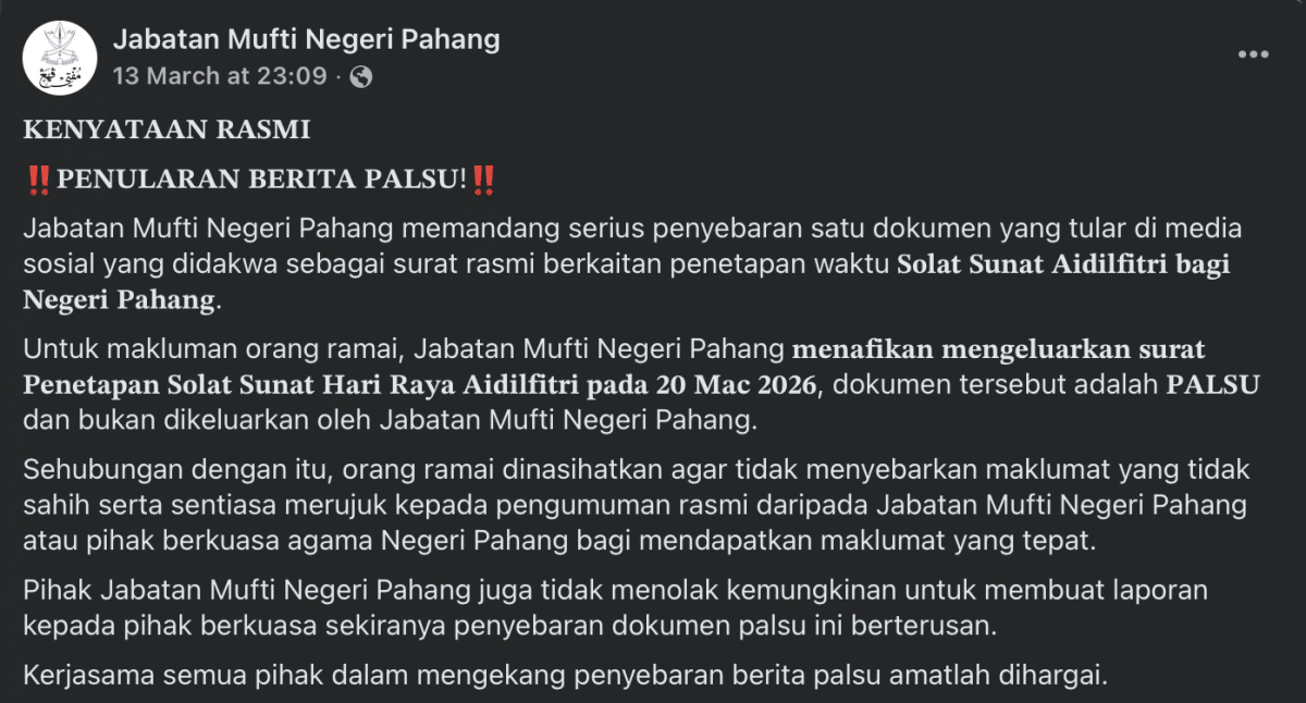 Surat solat Aidilfitri 20 Mac tular, Mufti Pahang sahkan ia palsu dan minta orang ramai rujuk sumber rasmi.