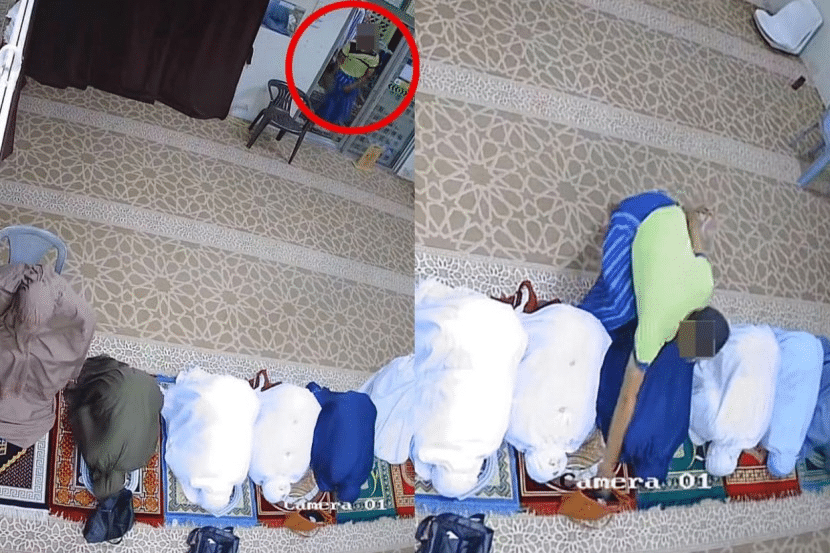 Dalam video yang jadi bualan ramai itu, kelihatan seorang lelaki memakai baju hijau, berkain pelikat biru dan berkopiah berdiri di pintu masuk ruang solat wanita. Dia tunggu masa jemaah sujud sebelum menyambar dua beg sekaligus.