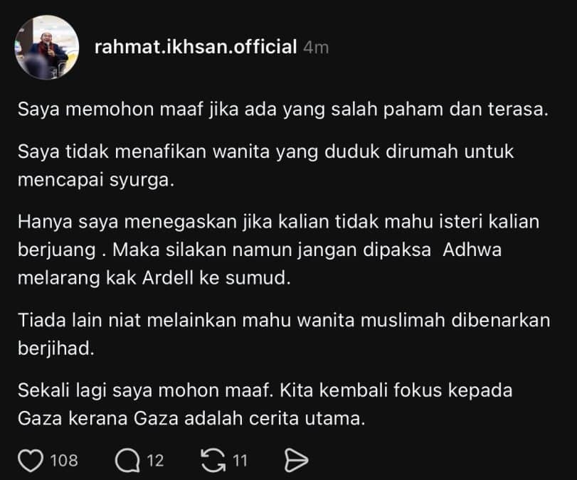 PU Rahmat Ikhsan mohon maaf susulan isu Sumud 2.0.