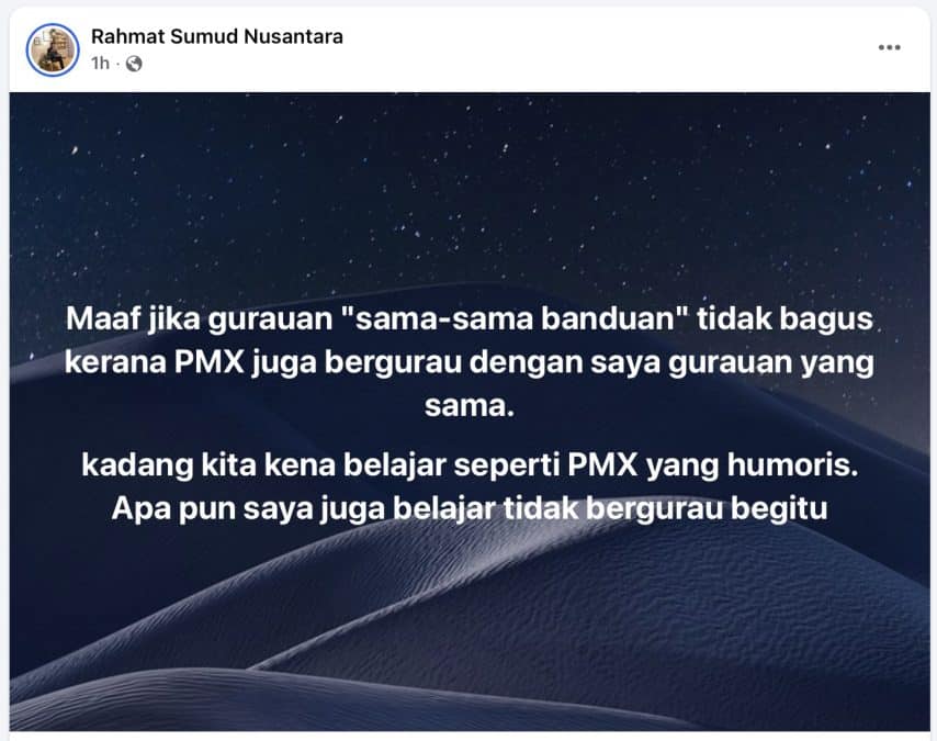 PU Rahmat berkata ia sekadar gurauan bersama PMX dan tiada niat menghina.